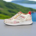 The Emily is a modern everyday sneaker. The upper is made from a combination of high-quality nappa, suede and printed nappa. Tongue and collar are padded with soft foam to give a comfortable feel. For the lining, calf leather is used in the whole sneaker. Calf leather helps to absorb moisture, has high breathability and is resilient to friction without losing its soft feel. The double zippers along the laces can be opened to make stepping into the shoe easier. The Emily sneaker offers enough space to accommodate your custom insole or footbed. The midsole is made from lightweight PU material combined with an Astro-lite bottom sole.