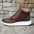 The Cloe is a modern everyday sneaker boot. The upper is made from a combination of high-quality nappa, suede and printed nappa. Tongue and collar are padded with soft foam to give a comfortable feel. For the lining, calf leather is used in the whole sneaker. Calf leather helps to absorb moisture, has high breathability and is resilient to friction without losing its soft feel. The double zippers along the laces can be opened to make stepping into the shoe easier. The Cloe sneaker boot offers enough space to accommodate your custom insole or footbed. The sole is made from lightweight PU material combined with an Astro-lite bottom sole.
